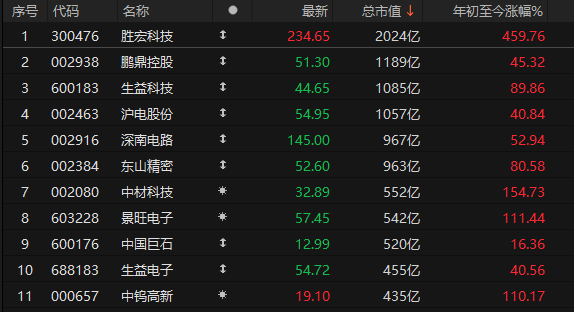 下流AI需求茂盛,行业增长可期,PCB产业链也成为二级商场投资者的“心头好”。本年4月份以来,多家公司的股价开启相接高涨模式。其中,胜宏科技市值冒昧2000亿元,鹏鼎控股、生益科技、沪电股份的市值均进步1000亿元,深南电路、东山精密的市值进步900亿元;而岁首于今,股价涨幅进步1倍的A股pcb主张股多达18家。