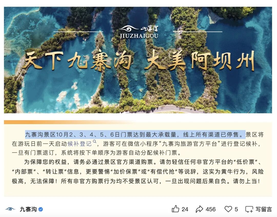 九寨沟景区10月2日-6日的门票达到最大承载量,线上通盘渠说念已停售。