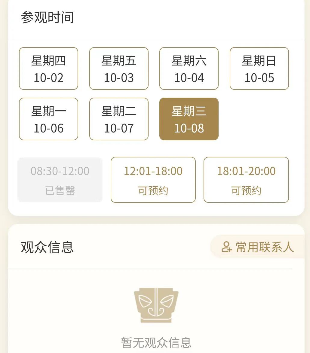 边界记者发稿时,成王人左近多个景区、博物馆部分时段门票已约满、售罄,未预约勿前去。其中,三星堆博物馆10月1日-7日全时段票售罄,仅剩10月8日部分时段还多余票;熊猫谷景区10月2日至4日全天以及10月5日门票已售罄,10月6日下昼门票行将售罄,其余场次尚多余票;四川科技馆10月2日-10月4日已约满,10月4日暂未通达预约;成王人博物馆10月1日-10月6日已约满。